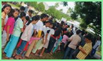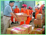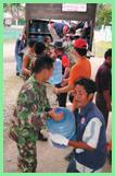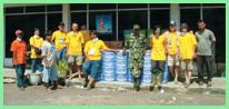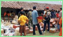 victims in Aceh help with the distribution of relief materials.